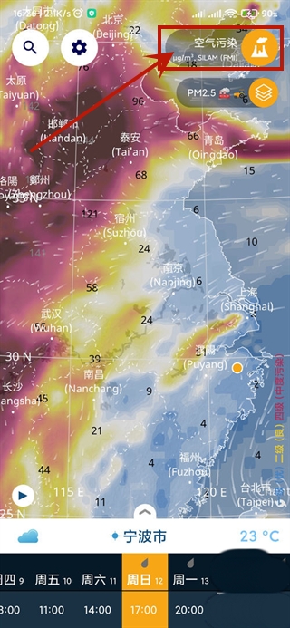 点击右上角的橙色圆形按钮,可在温度、体感温度、降水量、天气雷达、卫星云图、空气污染等气象指数之间切换。