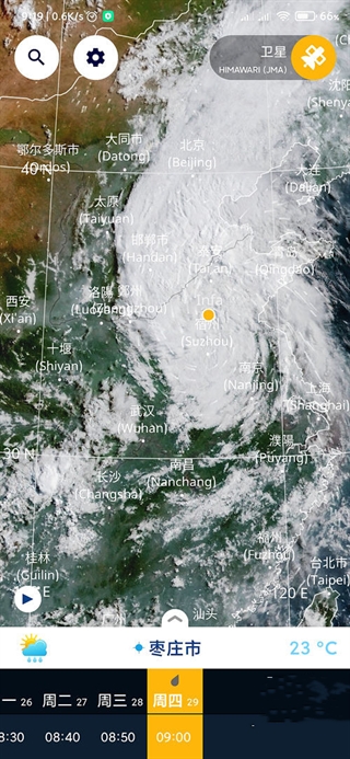 上图底部有日期、时间两行,可以分别向左右划动,来查看历史数值、未来预报数值。调整日期和时间时,在地图上的卫星云图也会随之变动。