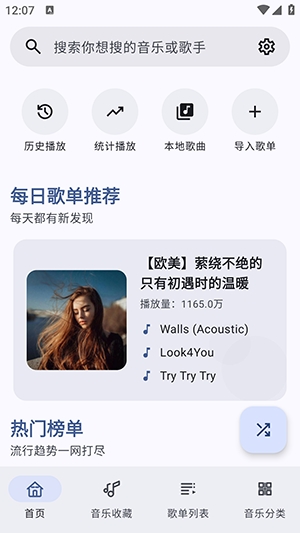 2、海量曲库与资源整合:汇聚全网多平台音乐资源,涵盖流行、经典等各类歌曲,支持在线播放与免费下载。提供每日更新的热门榜单、歌单推荐及精准搜索功能,方便用户发现新歌。