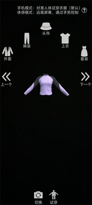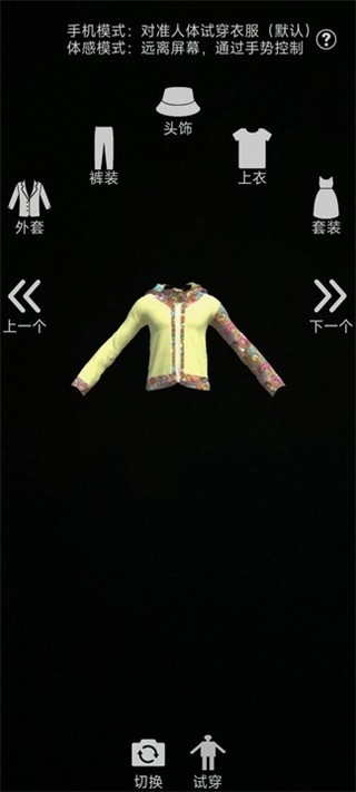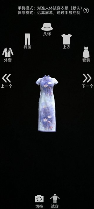 6、支持双模式,体感模式和手机模式,体感模式远离手机屏幕,通过手势控制试穿衣服;手机模式可以拍摄人体实景,给人体试穿衣服,还可以拍摄镜中影像,让普通穿衣镜秒变AR试衣魔镜,更多新奇场景,等你去发现