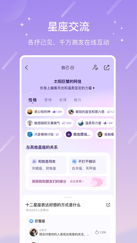测测星座是一款集心理测试、星座分析和社交互动于一体的APP,通过专业MBTI评估、趣味心理测试和精准星座解读,帮你多维度认识自己。在这里,你可以与AI智能体和测友畅聊星座人格,在开放社区分享心情,或向24小时在线的心理达人倾诉心声。更有好友合盘、心理沙盘等特色功能,让每一次互动都成为自我发现的旅程,助你以更积极的心态面对生活!