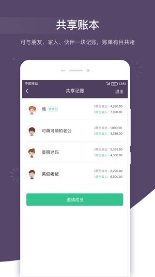 一键邀请家人、朋友、同事共同记账,账单实时同步。共睹每笔账单,告别糊涂账。