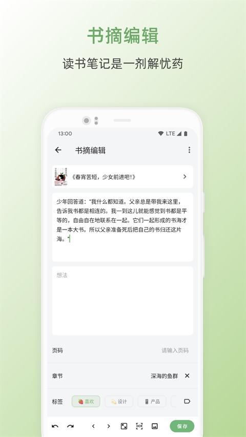 当我们阅读纸质书的时候,我们看到感触很深的话会用笔在它底下画线,但当阅读的是电子书的时候,我们遇到好的句子应该怎么做呢?用户可以通过把自己看的书导入到纸间书摘这个软件中,它会帮助用户记录阅读时长,读者喜欢的段落,同时它具有完善的保障体系,保证用户的信息不被泄露,为了使触人心弦的句子不再流浪天涯,大家快下载体验一下吧!