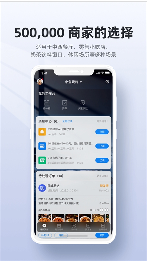 适用于大中小型中西餐厅、快餐店、奶茶店、酒吧、烧烤店、火锅店、咖啡馆、高校食堂等多种餐饮类型门店使用。
