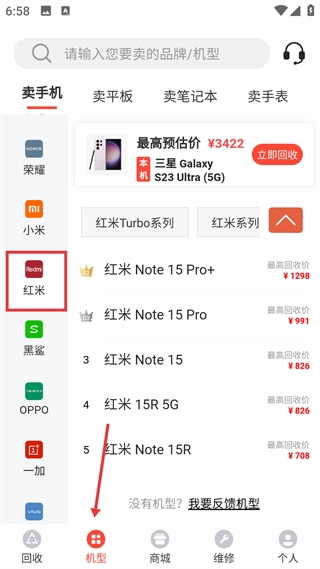 2、机型页面分类展示各品牌数码产品,标注对应机型最高回收价,支持选择机型发起回收流程。