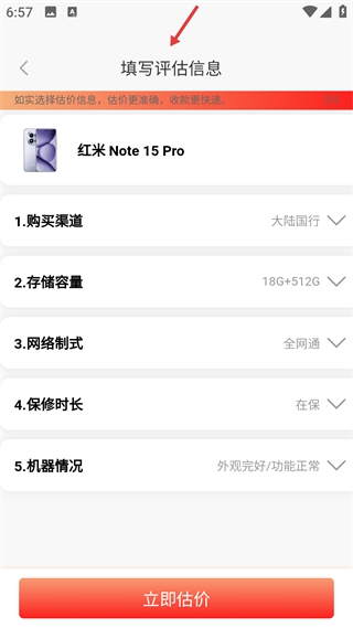 4、填写评估信息页需填写机型相关信息,确保估价准确,完成后点击立即估价获精准回收价。