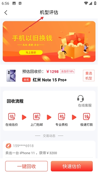 3、机型评估页展示选定机型预估回收价,说明回收流程,配备一键回收等按钮推进回收。
