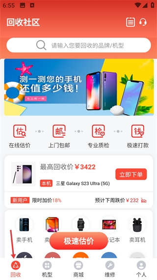 1、回收页提供在线估价等回收流程,展示机型回收价与新用户福利,是数码产品回收的综合入口。