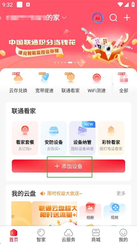 1、打开联通智家APP,首先需连接摄像头设备,点击首页的添加设备;