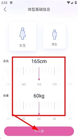 4、进入体型基础信息填写页面后,先选择性别,再设置身高与体重,完成这些操作后点击下一步,即可继续进行体型检测流程。