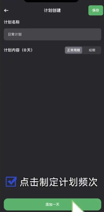 制定计划频次:点击“添加一天”按钮,开始设置训练日程。你可以设置训练日(如胸肩、背、臀腿等训练项目 )和休息日,最多可设置两周的计划。