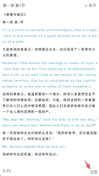4、可以看见是一段一翻译,用户用于学习英语是再好不过了,点击屏幕右下角的“设置”。