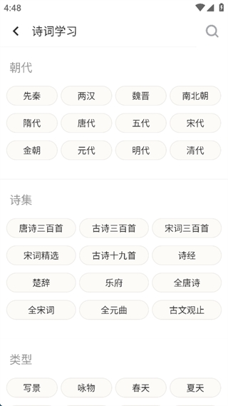9、除此之外,还可以进行诗词学习,根据朝代,诗集,类型进行分类,方便查找。