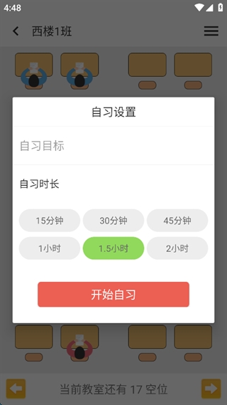8、可以在其中选择“自习目标”以及“自习时长”,帮助用户更好的沉浸于学习之中。