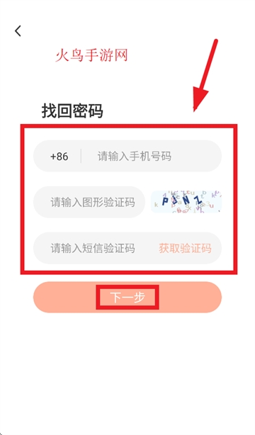3、在找回密码界面输入手机号,图形验证码,短信验证码,点击下一步设置新密码即可