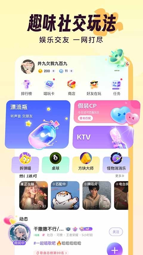 伴唱app是一款集合听歌、伴奏、交友、游戏于一体的音乐软件,在该软件中,用户既可以听喜欢的歌,也可以跟着伴奏唱歌,还可以进入k歌房结交好友,一起k歌,玩拆弹喵、桌球、方块大师、怪物消消乐等游戏,大家快来下载体验吧!